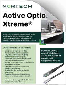Nortech Systems’ Active Optical Xtreme® (AOXTM) is a highly customizable platform that simplifies systems, data management and risk mitigation. This is a family of small form-factor hybrid Active Optical Cable assemblies, performing E-O/O-E within a single cable designed to accommodate longer distances, greater bandwidth and increased power delivery. This is all within a far more dense and lighter weight solution.